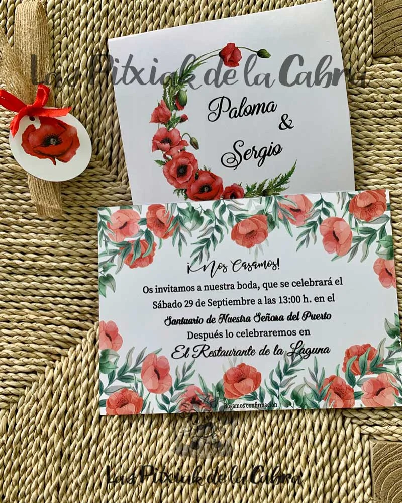 Invitación Low Cost Amapolas, es uno de nuestros modelos previamente creados, pero lo que veis en la tienda es una pequeña parte de lo que podemos hacer en papel, cualquier duda que tengáis consultadnos, ya que estamos abiertos a cualquier idea que tengáis. Y tened en cuenta que al hacer cada diseño desde cero hay miles de cosas que no tenemos publicadas en la tienda online.
